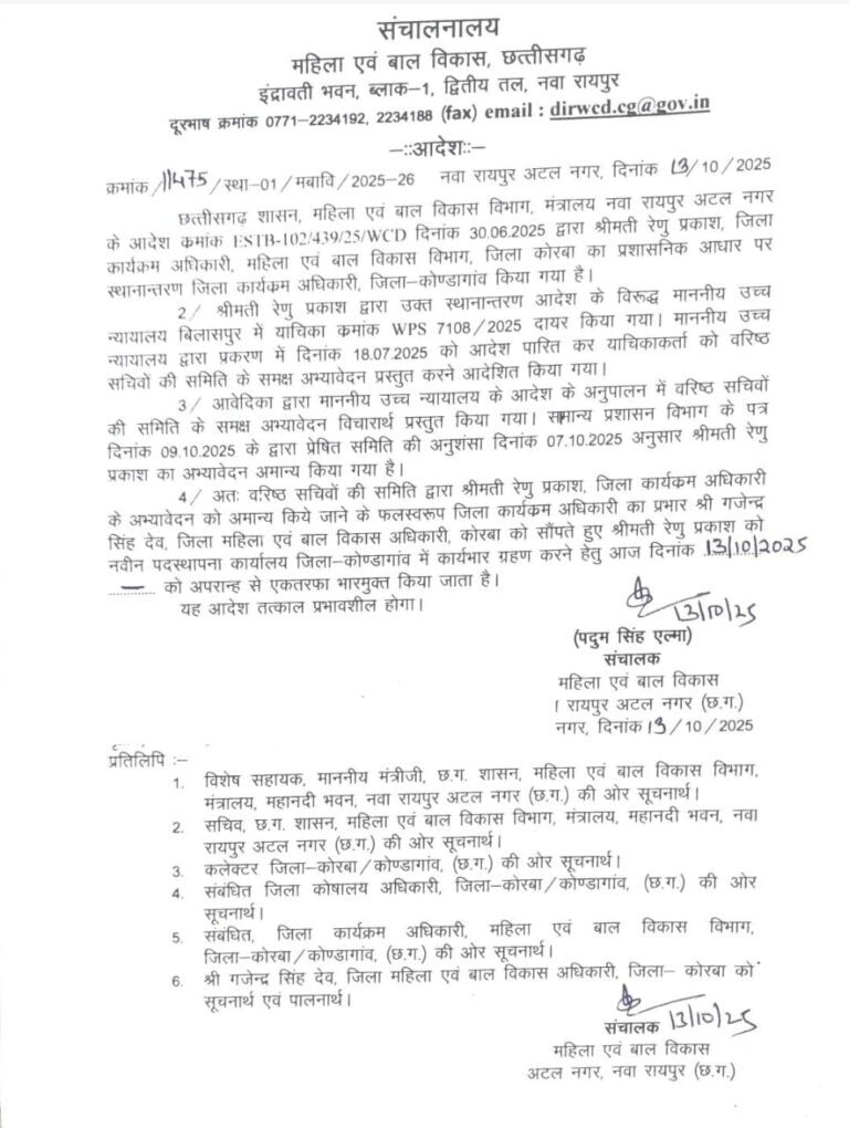 महिला एवं बाल विकास के संचालक पदुम सिंह एल्मा के हस्ताक्षर से आदेश पत्र जारी हुआ जिसमें रेणु प्रकाश को नवीन पदस्थापना स्थल कोण्डागांव में कार्यभार ग्रहण करने के लिए एकतरफा भारमुक्त किया गया है। आदेश तत्काल प्रभावशील किया गया है। जिला कार्यक्रम अधिकारी का प्रभार गजेंद्र सिंह देव को दिया गया है। शासन की कार्यवाही के बाद लंबे समय से दबाव में काम कर रहे विभाग के कर्मचारियों ने राहत की सांस ली है।