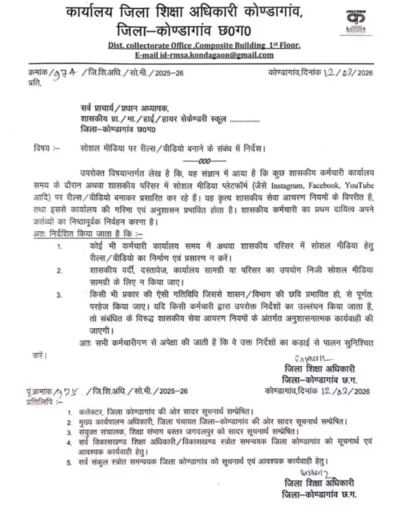 रायपुर। छत्तीसगढ़ में शासकीय कर्मचारियों द्वारा कार्यालय समय और सरकारी परिसरों में सोशल मीडिया के लिए रील्स व वीडियो बनाने के मामलों पर प्रशासन ने सख्त रुख अपनाया है। गरियाबंद जिला के पीएमश्री स्कूल से जुड़ा मामला सामने आने के बाद अब कोंडागांव जिला के जिला शिक्षा अधिकारी (डीईओ) ने स्पष्ट निर्देश जारी कर ऐसी गतिविधियों पर रोक लगा दी है।