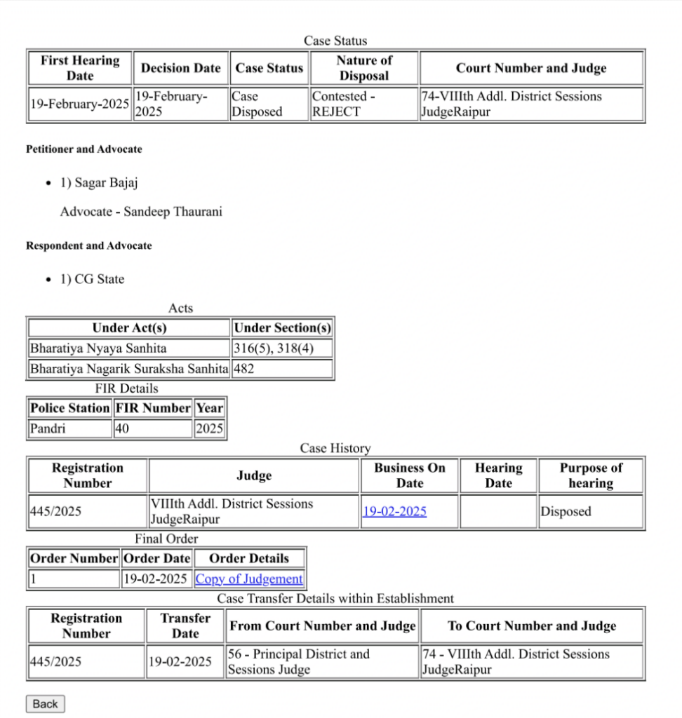 जानकारी के अनुसार जालसाज सागर बजाज की ओर से जिला एवं सत्र न्यायालय रायपुर में अग्रिम जमानत की अर्जी पेश की गई थी। न्यायालय ने मामले की सुनवाई के बाद सागर बजाज की ओर से प्रस्तुत अग्रिम जमानत का आवेदन खारिज कर दिया। सागर बजाज पुलिस रिकॉर्ड में फरार चल रहा है, जबकि सूत्रों के अनुसार बुधवार 19 फरवरी को वह एक सफेदपोश के साथ रायपुर में चार पहिया वाहन में घूमता देखा गया है। बताया जाता है कि एफ आई आर होने के बाद से वह पुलिस रिकॉर्ड में भले ही फरार है, लेकिन कोरबा में खुलेआम घूमता रहा है।