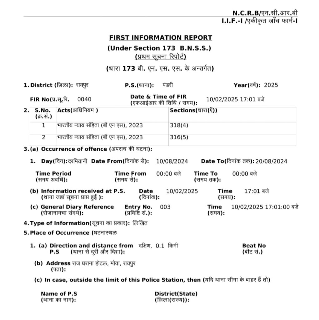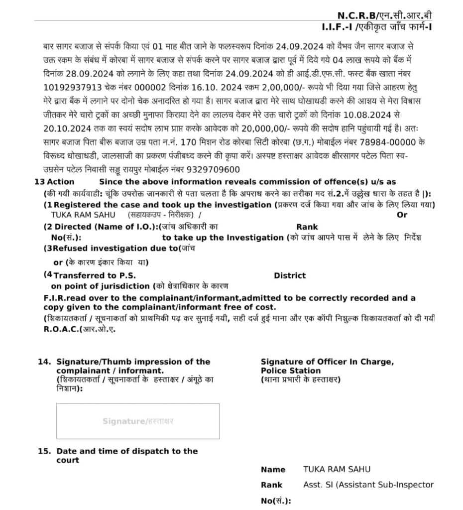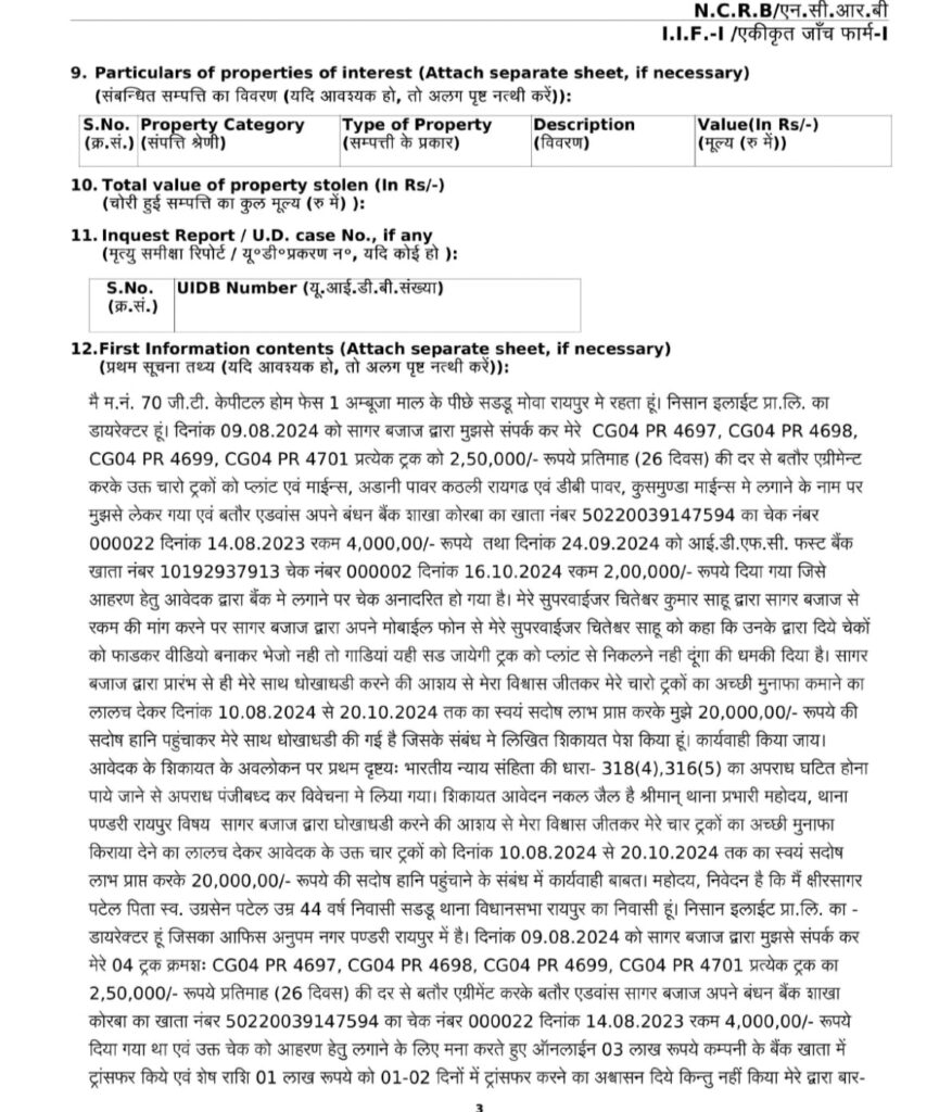 पुलिस सूत्रों के अनुसार रायपुर के 70 जी.टी. केपीटल होम सडडू निवासी क्षीर सागर ने मोवा थाना गत दिनों रिपोर्ट दर्ज कराई थी कि वह निशान इलाईट प्रा.लि. का डायरेक्टर है। 6 माह पूर्व उसको कोरबा के सागर का फोन आया था। जिसमें उसने कम्पनी से चार ट्रक को 2,50,000/- रूपये प्रतिमाह की दर से एग्रीमेन्ट कर प्लांट एवं माईन्स, अडानी पावर कठली रायगढ एवं डीबी पावर, कुसमुण्डा माईन्स मे लगाने का झांसा देकर चेक से एडवांस पेमेंट कर अपने बंधन बैंक खाता शाखा कोरबा के नाम से 4 और 5 लाख का चेक दिया था। जिसे लेकर क्षीर सागर ने कम्पनी से अपने चार ट्रक को सागर बजाज के पास कोरबा रवाना कर दिया। जहां ट्रकों से कोल माइंस और प्लांट में चलावाया जा रहा था। क्षिर सागर ने जब सागर के दिए चेक को बैंक में लगाया तो वह बैंक में अनादरित हो गया। इस पर कम्पनी के एक सुपर वाइजर चितेश्वर ने सागर को पैसा वापस करने के लिए फोन किया। फोन करने पर सागर ने चितरेश्वर को चेक फाड़ कर वीडियो बनाने को कहा और गाड़ी वापस न करने की धमकी दी। सागर ने क्षीरसागर को धोखाधड़ी करने के आशय से विश्वास जीतकर मुनाफा कमाने का लालच देकर धोखाधड़ी कर कम्पनी को 20 लाख रूपए का नुकसान पुहंचाया। कम्पनी डायरेक्टर ने इसकी शिकायत पुलिस थाना में दर्ज कराया। पुलिस ने कोरबा निवासी सागर के खिलाफ भारतीय न्याय संहिता की धारा 316-5, 318-4 एवं भारतीय नागरिक सुरक्षा संहिता की धारा 482 का प्रकरण दर्ज किया है।