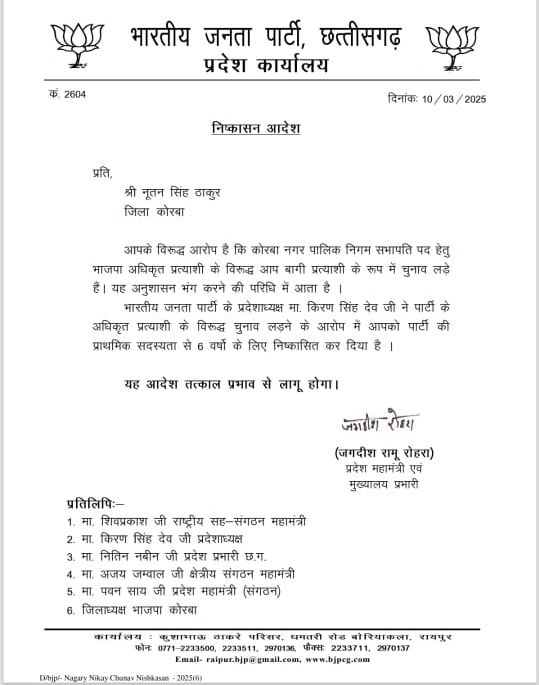 इस बीच छत्तीसगढ़ भाजपा ने अनुशासनहीनता के इस मामले में बड़ी कार्रवाई करते हुए कोरबा नगर निगम के नवनिर्वाचित सभापति को पार्टी से निष्कासित कर दिया है। कोरबा में नूतन सिंह ठाकुर पार्टी के सभापति के अधिकृत प्रत्याशी के खिलाफ चुनाव लड़े थे और उन्हें जीत मिली थी। इससे पहले नगरीय निकाय चुनाव में कोरबा नगर निगम में बीजेपी को बम्फर बहुमत मिला है। पार्टी का मेयर निर्वाचित हुआ है। कुल 67 वार्ड पार्षदों में 45 भाजपा पार्षद जीतकर आए थे। इसके बाद सभापति चुनाव के लिए पार्टी ने हितानंद अग्रवाल को अधिकृत प्रत्याशी बनाया था, जिन्हें इस बगावत के कारण शर्मनाक हार का सामना करना पड़ा। इसी वजह से चुनाव के 48 घंटे के भीतर नूतन सिंह ठाकुर को पार्टी की प्राथमिक सदस्यता से 6 वर्षों के लिए निष्कासित कर दिया गया है। देखें आदेश –