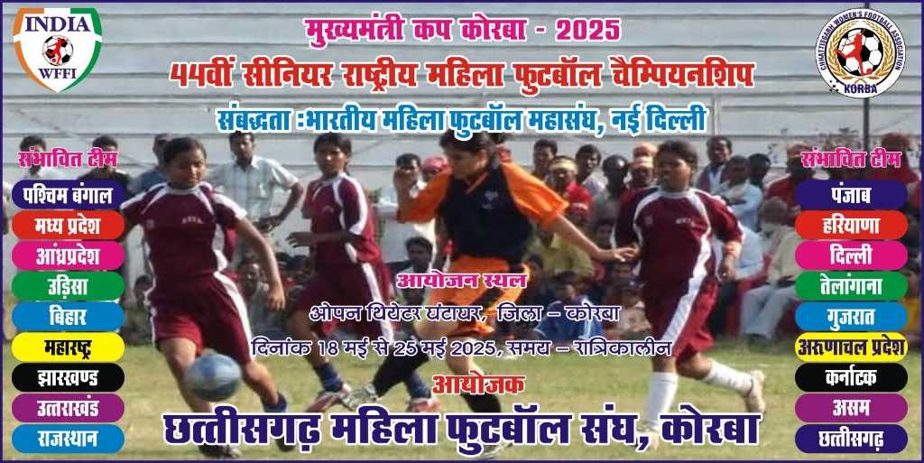 कोरबा 24 अप्रैल। जिले में एक बार फिर महिला फुटबॉल का राष्ट्रीय स्तर पर भव्य आयोजन होने जा रहा है। मुख्यमंत्री कप कोरबा-2025 के अंतर्गत 44वीं सीनियर राष्ट्रीय महिला फुटबॉल चौंपियनशिप का आयोजन 18 मई से 25 मई तक किया जाएगा। यह आयोजन घंटाघर कोरबा स्थित ओपन थिएटर में रात्रिकालीन मैचों के रूप में आयोजित किया जाएगा, जो महिला खेलों को नई पहचान देने की दिशा में एक महत्वपूर्ण कदम माना जा रहा है।