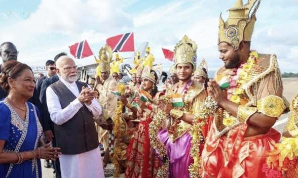 पोर्ट ऑफ स्पेन में झाल-तासे और भोजपुरी चौताल से पारंपरिक रूप से हुआ पी एम मोदी का स्वागत