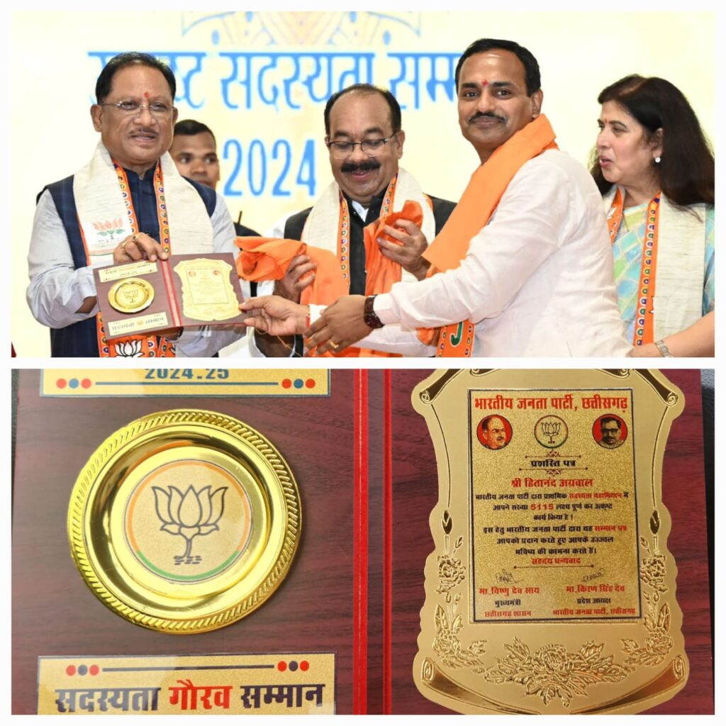 जहां प्रदेश से आए हुए ऐसे सदस्यों का सम्मान किया गया जिन्होंने एक हजार से ऊपर प्राथमिक सदस्य बनाये हैं। इस कार्यक्रम अंतर्गत 5000 से ऊपर सदस्यता बनाने वालों को “सदस्यता गौरव सम्मान” से सम्मानित दिया गया। इसी कड़ी में कोरबा जिले ले जुझारू भाजपा सदस्य हितानंद अग्रवाल को प्रदेश के मुख्यमंत्री विष्णुदेव साय एवं प्रदेश भाजपा अध्यक्ष किरण सिंह देव के द्वारा यह गौरव सम्मान दिया गया।