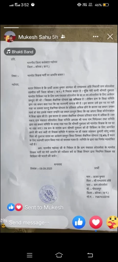 कोरबा, 09 सितम्बर 2025 — जिला कोरबा के ग्राम लोतलोता में मानदेय शिक्षक भर्ती को लेकर एक बड़ा विवाद सामने आया है। ग्रामवासी अजय कुमार ने जिला कलेक्टर को एक लिखित आवेदन देकर भर्ती प्रक्रिया में अनियमितता और भेदभाव का आरोप लगाया है।