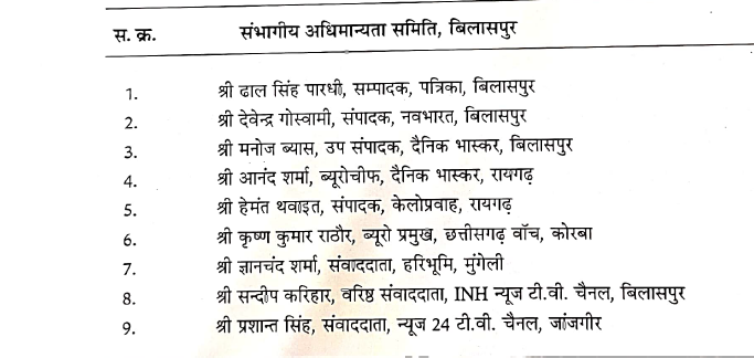 राज्य शासन की यह समिति पत्रकारों की अधिमान्यता पर अंतिम अनुशंसा करती है और इसकी बैठकों का संचालन जनसंपर्क विभाग द्वारा किया जाता है। पत्रकार साथी अधिमान्यता से जुड़ी जानकारी या सुझावों के लिए कृष्ण कुमार राठौर से संपर्क कर सकते हैं।
