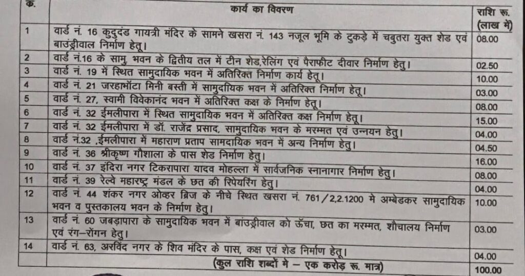 बिलासपुर. शहर के सर्वांगीण विकास और नागरिक सुविधाओं के विस्तार को ध्यान में रखते हुए पूर्व मंत्री एवं नगर विधायक अमर अग्रवाल ने वार्ड क्रमांक 16, 19, 21, 27, 32, 36, 37, 39, 44, 60 एवं 63 में विभिन्न निर्माण एवं उन्नयन कार्यों के लिए कुल 1 करोड़ रुपये की राशि स्वीकृत की है।