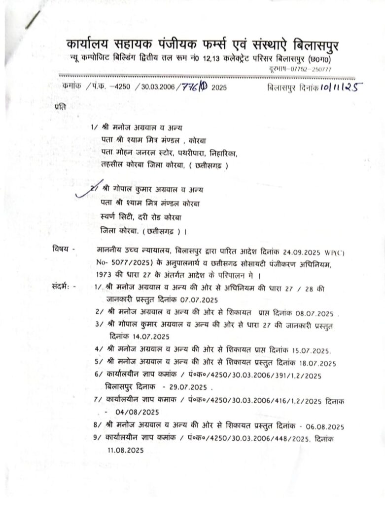 माननीय उच्च न्यायालय, छत्तीसगढ़ के आदेश (WPC 6329/2025) के अनुपालन में, माननीय पंजीयक महोदय, रायपुर द्वारा दिनांक 02 जून 2025 को एक महत्वपूर्ण आदेश पारित किया गया, जिसके अंतर्गत दिनांक 01 अक्टूबर 2024 को गठित मनोज अग्रवाल उर्फ मनी की कार्यकारिणी को अग्राह्य (अमान्य) घोषित किया गया और संस्था को 45 दिवस में नये निर्वाचन कराने के निर्देश दिए गये। उक्त आदेश के परिपालन में, दिनांक 10 जुलाई 2025 को निर्वाचन अधिकारी, सभापति नगर पालिका निगम नूतन सिंह ठाकुर की देखरेख में एवं पुलिस प्रशासन की उपस्थिति में विधिपूर्वक निर्वाचन प्रक्रिया अपनाते हुए श्री श्याम मित्र मंडल, कोरबा का निर्वाचन संपन्न कराया गया, जिसमें सी.ए. श्री गोपाल अग्रवाल भारी बहुमत से विजयी घोषित हुए। वहीं दूसरी ओर, पूर्व अमान्य कार्यकारिणी द्वारा तथ्यों को भ्रामक रूप से प्रस्तुत करते हुए दिनांक 01 जुलाई 2025 को स्वयंभू कार्यकारिणी का गठन किया गया और दिनांक 07 जुलाई 2025 को माननीय सहायक पंजीयक, फर्म्स एंड सोसायटीज़, बिलासपुर ज्ञान प्रकाश साहू) के समक्ष धारा 27 के अंतर्गत विवरण प्रस्तुत कर दिया गया। दो अलग-अलग चुनाव संबंधी जानकारियाँ प्राप्त होने पर, माननीय सहायक पंजीयक महोदय द्वारा निष्पक्ष कार्यवाही हेतु दोनों पक्षों से अभिलेखों एवं साक्ष्यों की जांच हेतु पत्र जारी किए गए। परीक्षण के उपरांत को गोपाल अग्रवाल की कार्यकारिणी को वैद्य माना गया।