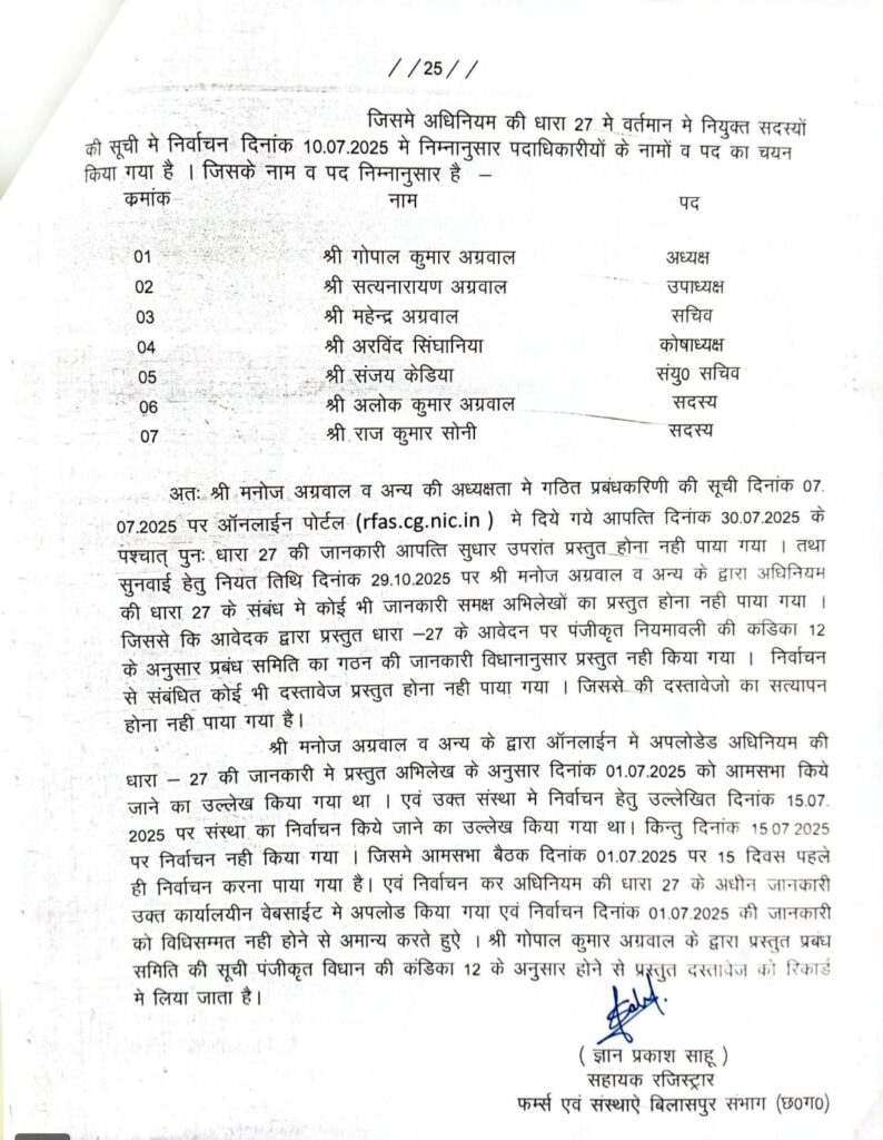 श्री श्याम मित्र मंडल, कोरबा के चुनाव से जुड़े विवाद पर सहायक पंजीयक, फर्म्स एंड सोसायटीज़, बिलासपुर ज्ञान प्रकाश साहू) द्वारा दिनांक 10 नवंबर 2025 को एक महत्वपूर्ण आदेश पारित किया गया है। आदेश में कहा गया है कि संस्था कि तरफ से गोपाल अग्रवाल द्वारा दिनांक 14/07/2025 को प्रस्तुत धारा 27 (छत्तीसगढ़ सोसायटी पंजीयन अधिनियम) के अंतर्गत प्रस्तुत निर्वाचन सूचना, अभिलेख, मतगणना विवरण तथा ऑनलाइन प्रस्तुत समिति सूची नियम अनुसार पाई गई। अधिकारियों द्वारा प्रस्तुत अभिलेखों का परीक्षण किया गया। परीक्षण के उपरांत सहायक पंजीयक ने निम्नलिखित पदाधिकारियों की समिति सूची को वैध एवं स्वीकृत कार्यकारिणी घोषित किया :