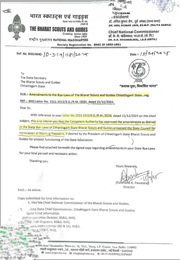 रायपुर। भारत स्काउट्स एंड गाइड्स छत्तीसगढ़ से जुड़ा एक महत्वपूर्ण प्रशासनिक निर्णय सामने आया है। संगठन की राज्य परिषद की बैठक में पारित उपनियम संशोधन को राष्ट्रीय मुख्यालय से औपचारिक स्वीकृति मिल गई है। इस संशोधन के तहत लोकसभा सांसद बृजमोहन अग्रवाल आगामी पांच वर्षों तक भारत स्काउट्स एंड गाइड्स छत्तीसगढ़ के राज्य अध्यक्ष पद पर बने रहेंगे।