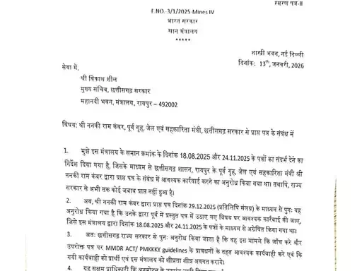 कोरबा। डिस्ट्रिक्ट मिनरल फंड (DMF) के कथित दुरुपयोग के मामले में केंद्र सरकार ने छत्तीसगढ़ के मुख्य सचिव विकास शील को स्मरण पत्र जारी किया है। यह कार्रवाई भाजपा के वरिष्ठ आदिवासी नेता व पूर्व गृहमंत्री ननकी राम कंवर की शिकायत के बाद की गई है। शिकायत में बालको क्षेत्र की सड़क निर्माण परियोजना के लिए डीएमएफ फंड के कथित गलत इस्तेमाल का आरोप लगाया गया है।