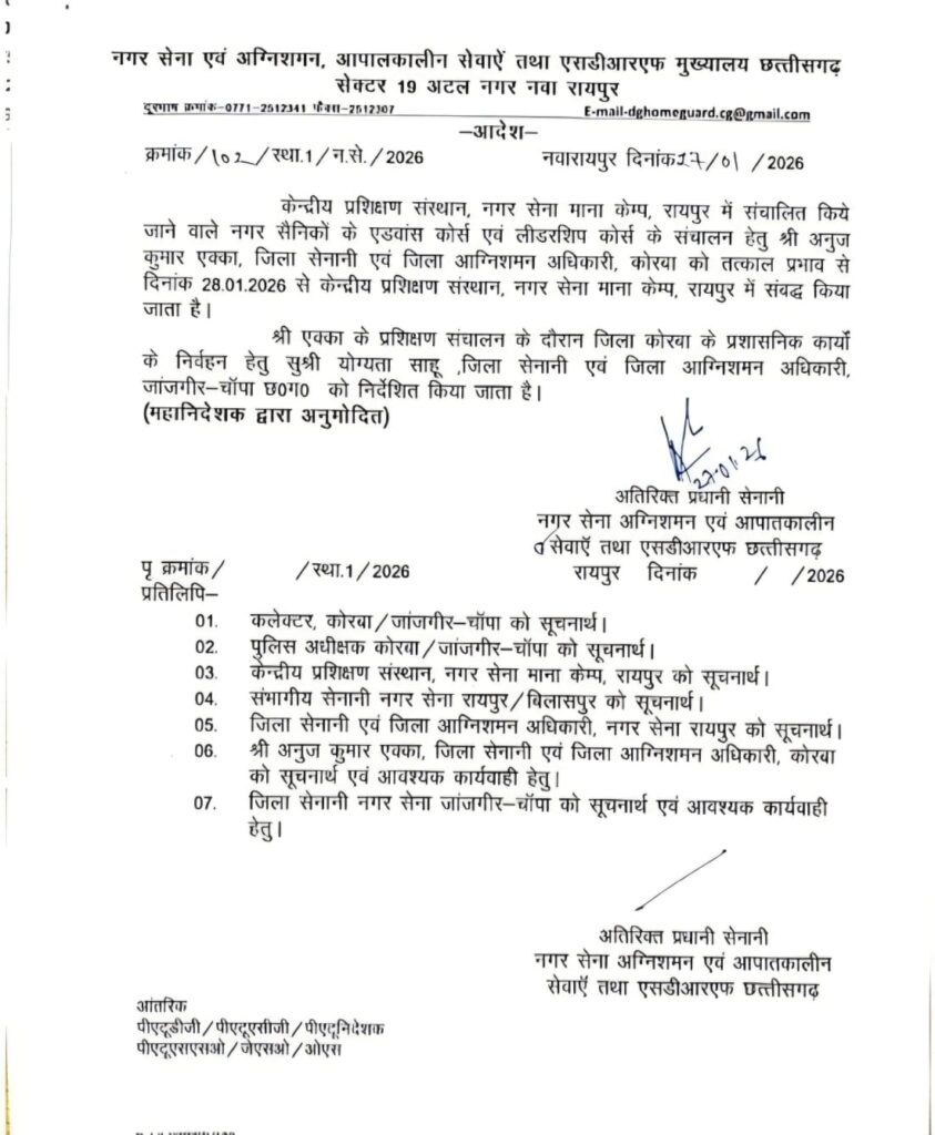 कोरबा 28 जनवरी। नगर सेना जवान के जहर सेवन मामले में आखिरकार बड़ा प्रशासनिक कदम उठाया गया है। कोरबा के जिला सेनानी एवं जिला अग्निशमन अधिकारी अनुज कुमार एक्का को तत्काल प्रभाव से रायपुर मुख्यालय अटैच कर दिया गया है। आदेश 27 जनवरी को जारी हुआ और आज 28 जनवरी से उन्हें रायपुर स्थित नगर सेना माना कैंप के केंद्रीय प्रशिक्षण संस्थान में रिपोर्ट करने के निर्देश दिए गए हैं।