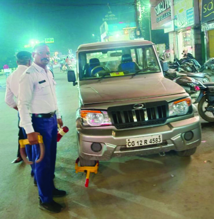 मनमानी पार्किंग से बाधा उत्पन्न, ट्रैफिक पुलिस ने व्हील क्लैम्प के तहत वाहन चालकों पर की कार्रवाई