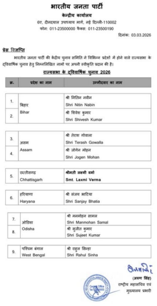 नईदिल्ली। बीजेपी ने राज्यसभा द्विवार्षिक चुनाव 2026 के लिए विभिन्न राज्यों से अपने उम्मीदवारों की लिस्ट जारी कर दी है। बिहार से 2, असम से 2, ओडिशा से 2, छत्तीसगढ, पश्चिम बंगाल और हरियाणा से 1-1 राज्यसभा उम्मीदवार की घोषणा की गई है। बीजेपी के राष्ट्रीय अध्यक्ष नितिन नबीन बिहार से राज्यसभा उम्मीदवार बनाए गए हैं। नितिन नबीन मूलता बिहार से ही आते हैं और इस समय बिहार सरकार में मंत्री भी हैं। नबीन के अलावा शिवेश कुमार को बिहार से राज्यसभा उम्मीदवार घोषित किया गया है।