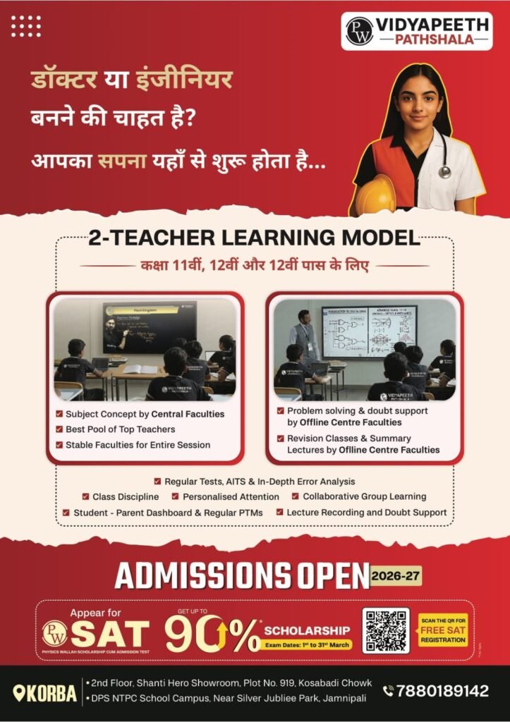 कोरबा. औद्योगिक नगरी कोरबा अब शिक्षा के क्षेत्र में भी तेजी से उभर रहा है। देश के चर्चित एडटेक प्लेटफॉर्म Physics Wallah ने अपने विद्यापीठ पाठशाला, कोरबा केंद्र के माध्यम से Academic Session 2026–27 के लिए एडमिशन प्रक्रिया शुरू कर दी है। इस पहल से अब स्थानीय छात्रों को बेहतर शिक्षा के लिए बड़े शहरों पर निर्भर नहीं रहना पड़ेगा।