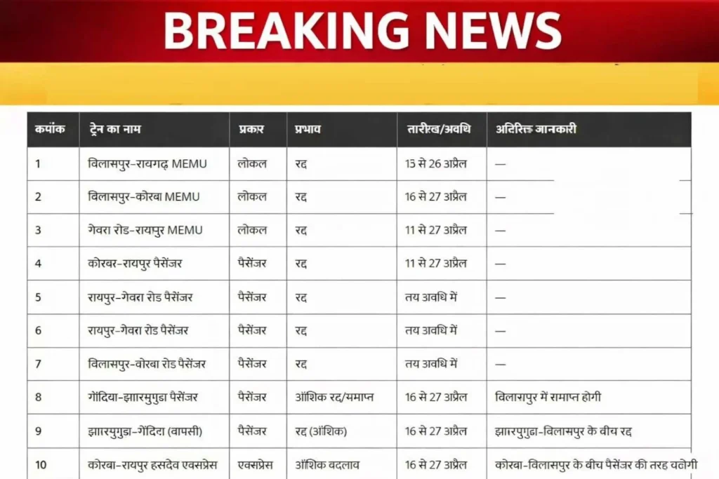 - बिलासपुर–रायगढ़ MEMU: 15 से 26 अप्रैल तक रद्द