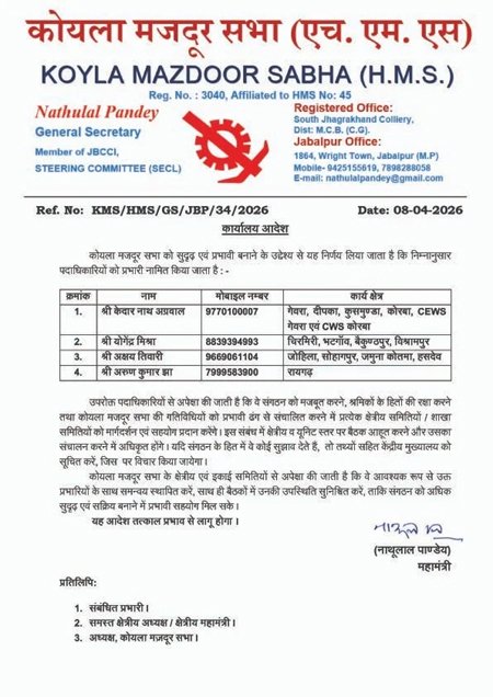 कोरबा 08 अपै्रल। कोयला मजदूर सभा (एच.एम.एस.) ने संगठन को सुदृढ़ एवं प्रभावी बनाने के उद्देश्य से विभिन्न क्षेत्रों के लिए नए प्रभारियों की नियुक्ति की है। इस संबंध में महासचिव नाथूलाल पाण्डेय द्वारा कार्यालय आदेश जारी किया गया है।