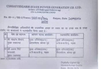 जानकारी के अनुसार, डीएसपीएम में पदस्थ मुख्य रासायनज्ञ गोवर्धन सिदार को कोरबा से जांजगीर जिले के मड़वा स्थित पावर प्लांट भेजा गया है। वहीं मड़वा में पदस्थ मुख्य रासायनिक अधिकारी उत्तम सिंह चंद्रवंशी को कोरबा स्थित डीएसपीएम में पदस्थ किया गया है।
