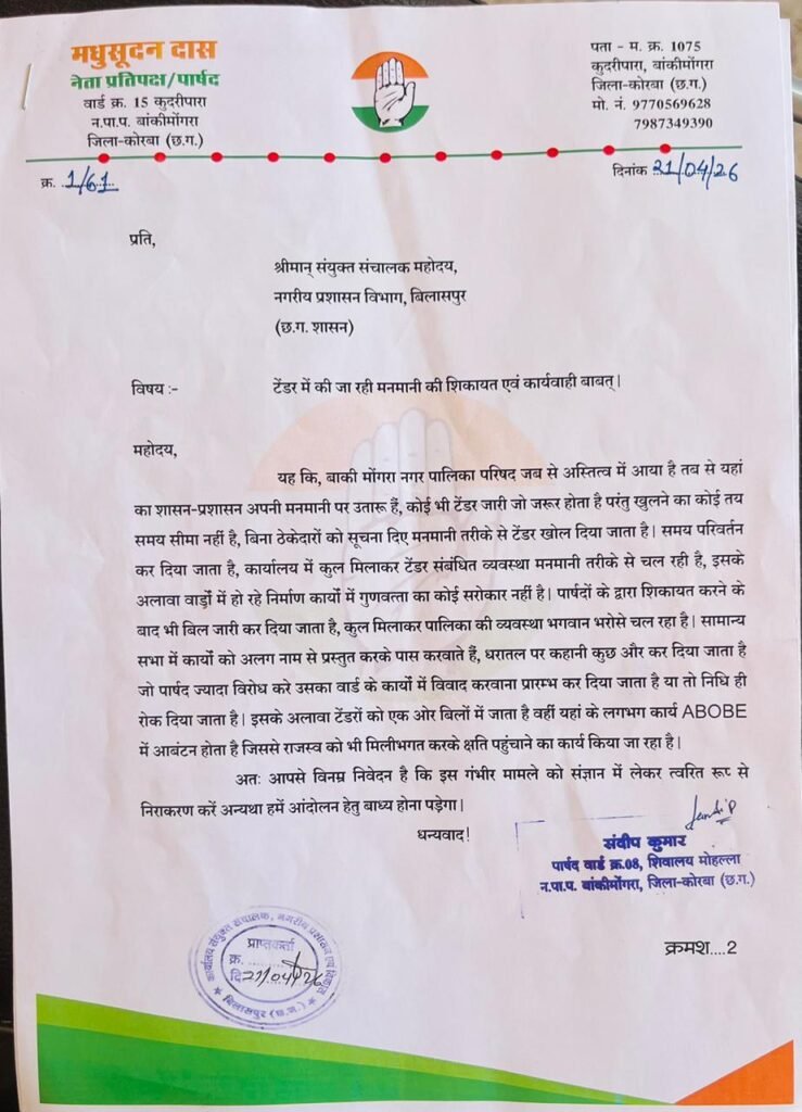 कोरबा-बांकीमोंगरा 24 अपै्रल। नगर पालिका परिषद बाँकी मोंगरा में टेंडर प्रक्रिया में लगातार की जा रही मनमानी को लेकर विपक्षी पार्षदों ने संयुक्त रूप से संयुक्त संचालक,बिलासपुर को पत्र लिखकर कार्यवाही की माँग की है अन्यथा आंदोलन की चेतावनी दी है।
