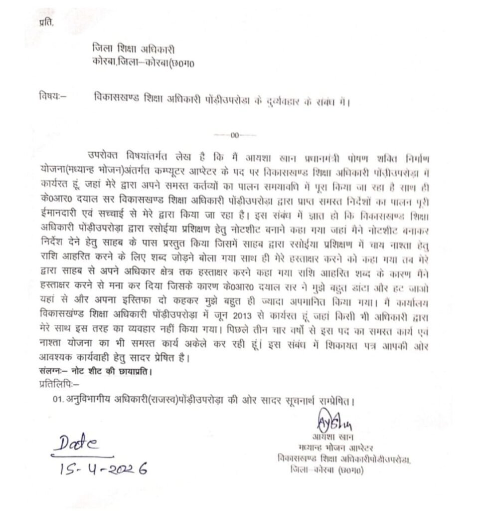 कोरबा 24 अपै्रल। विकासखण्ड शिक्षा अधिकारी पोड़ी-उपरोड़ा के द्वारा दुर्व्यवहार के संबंध में जिला शिक्षा अधिकारी कोरबा से शिकायत की गई है।