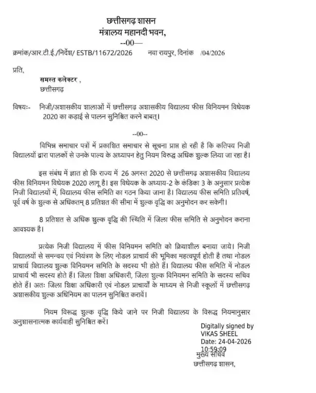 रायपुर — छत्तीसगढ़ में निजी स्कूलों द्वारा की जा रही मनमानी फीस वृद्धि पर अब सख्ती शुरू हो गई है। मुख्य सचिव विकासशील ने सभी जिला कलेक्टरों को निर्देश जारी करते हुए कहा है कि राज्य में छत्तीसगढ़ अशासकीय विद्यालय फीस विनियमन अधिनियम 2020 का कड़ाई से पालन सुनिश्चित किया जाए।