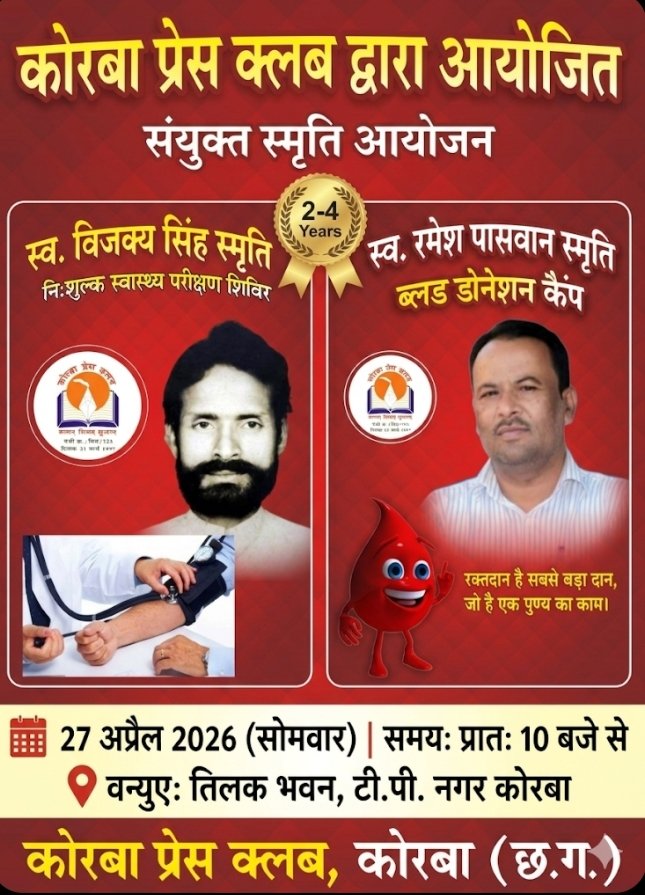 कलम के प्रहरी स्व. पासवान व स्व. विजय सिंह की स्मृति में कोरबा प्रेस क्लब का ब्लड डोनेशन एवं हेल्थ कैंप आज