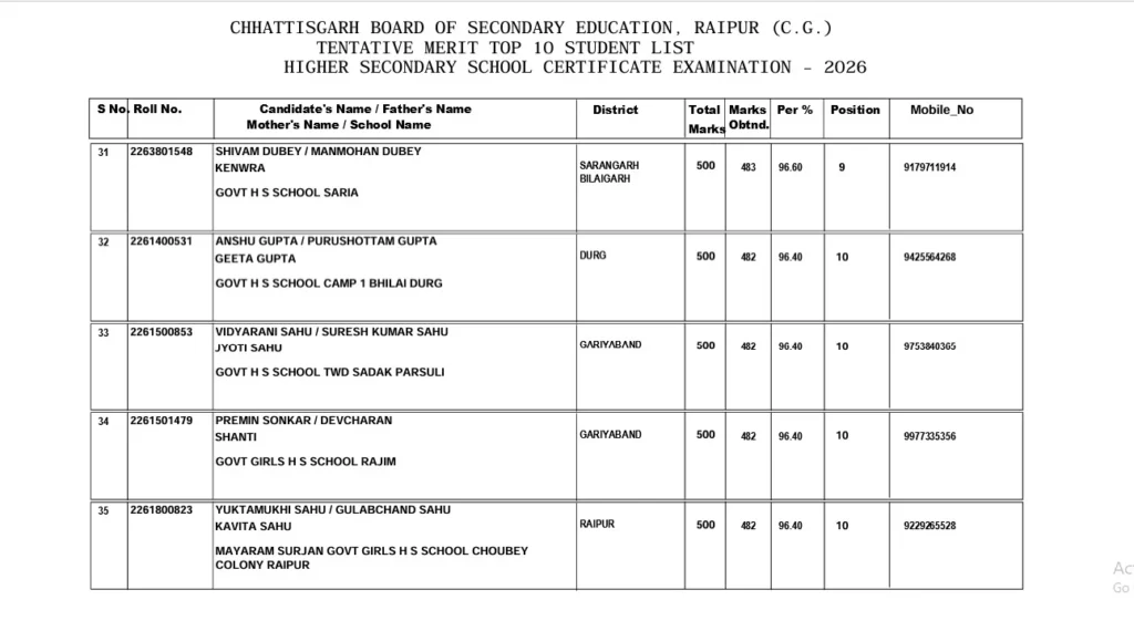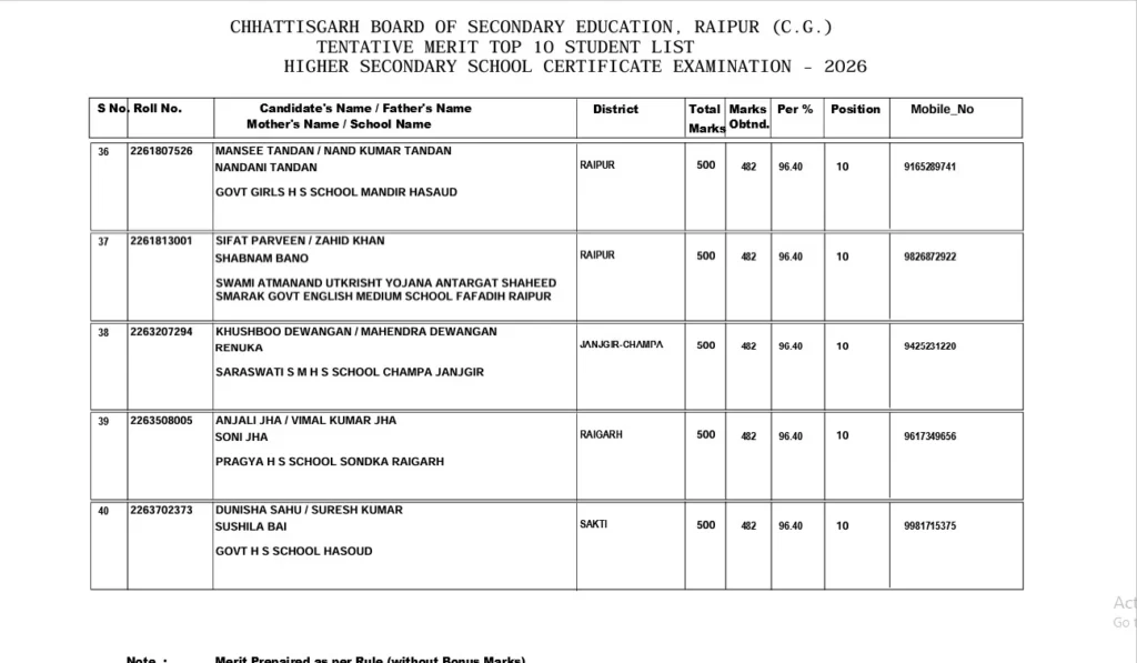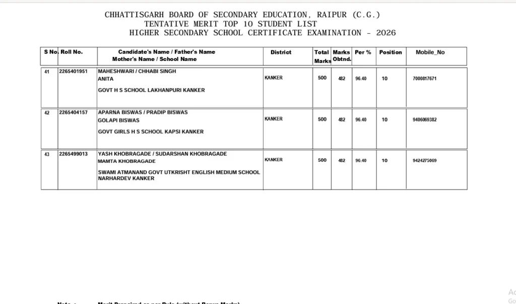 रायपुर, 29 अप्रैल 2026। छत्तीसगढ़ बोर्ड ने 10वीं और 12वीं की परीक्षा का परिणाम जारी कर दिया है। इसके साथ ही मेरिट लिस्ट में स्थान पाने वाले मेधावी विद्यार्थियों के नाम भी घोषित कर दिए गए हैं।